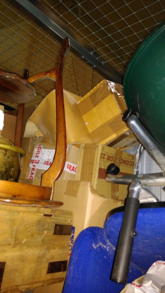 After clearing our visit with Noel and Sheila at the storage place we loaded the dogs into the car and set off to find some clothes for me and the store cupboard for Jacqui.  We were greeted by a most distressed Sheila and a furious Noel who led us down the dim corridors to our locker – one of four, we were told.  Shocked by this news we tried to lift the shutter but it was jammed.  This was the cause of Noel’s anger – he was upset about damage to his lockers but also furious for us.  After struggling for nearly half an hour I managed to wriggle under the door and tried to free the shutter.  There were boxes thrown in seemingly at random with everything piled up and tipping over.  Furniture was wedged in at odd angles and boxes were split, spilling their contents across the heap.  Across the top were wedged the pictures, all packed and labelled “Keep Upright” “Do not stack”.  It was a car crash.